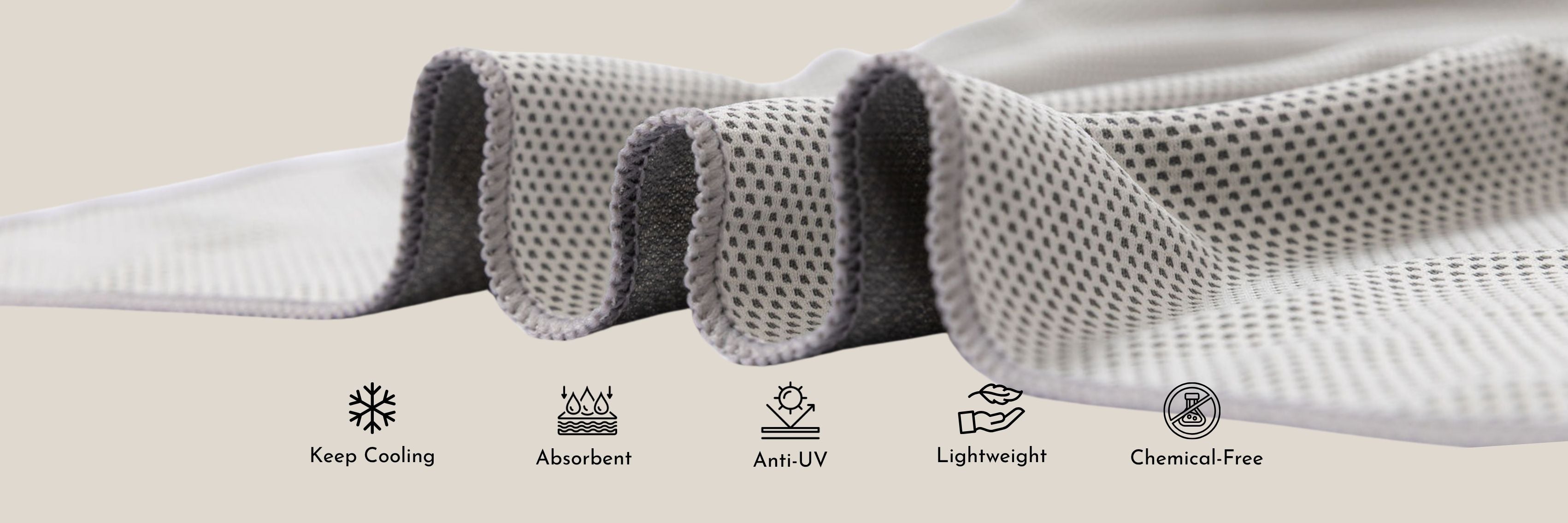 The soft, lightweight mesh is OEKO-TEX® certified and free from chemicals, cooling agents or irritants. The cooling effect comes from evaporative technology only.